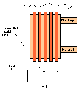 Specifically, the use of a fluidized bed, utilizing fuel of any type (biomass, bio-oil, propane, other hydrocarbons, etc) and air, to provide the heat to the reactor chamber proper. The reactor itself would reside inside the fluidized bed that is providing the process heat.