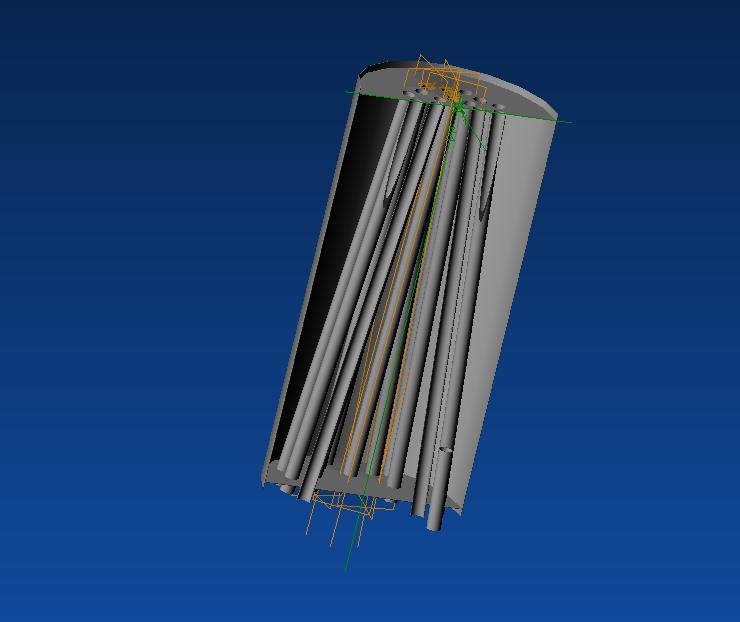 The heat source gases flow through the center of the pipes, heating them. The volume inside the cylinder (and outside the pipes) is filled with a fine, sifted sand. This sand serves to transfer the heat from the pipes to the biomass.
